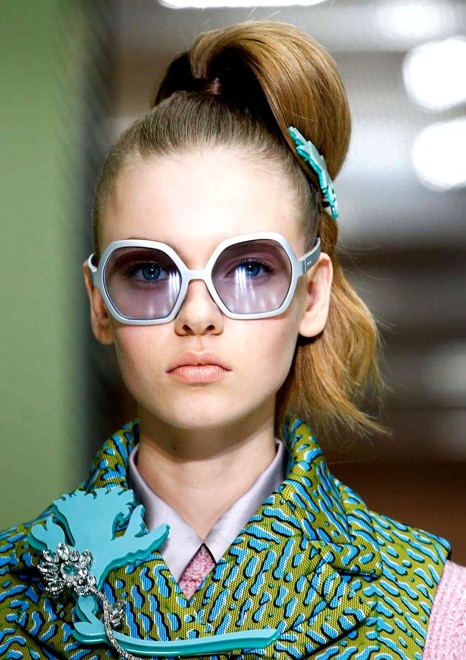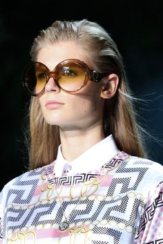 Величезні сонячні окуляри були представлені нам Prada, Dolce & Gabbana, Versace, Gucci. Окуляри від Prada мають характерні ажурні дужки. Моделі від Dolce & Gabbana – елегантні, навіть суворі, прикрашені декоративними кристалами. . Бренд Gucci у власних показах також використав величезні сонцезахисні окуляри, поєднуючи їх з кольором одягу.