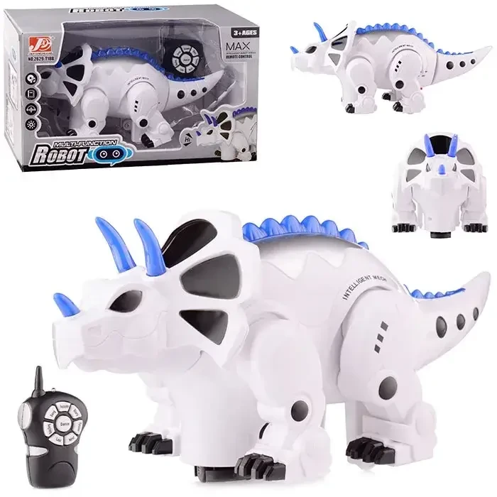 • У комплекті: • динозавр (працює від 3-х батарей "АА" - не входять до комплекту). • пульт керування (працює від 2-х батарей "АА" - не входять до комплекту). • Розміри динозавра (ДхШхВ): 33.5х14.5х15.5 см. • Особливості іграшки: - перемикач вкл/викл., - рух у довільному напрямку, - яскраве мерехтливе підсвічування корпусу, - розповідає історії, - читає слова англійською мовою, - мелодії та дитячі пісеньки, - вибір пісень (попередня, наступна), - відключення підсвічування та рухів, - озвучення англійською мовою. • Матеріал: пластик, елементи із металу. • Відповідає вимогам безпеки та стандартам якості продукції. • Для дітей віком від 3-х років.